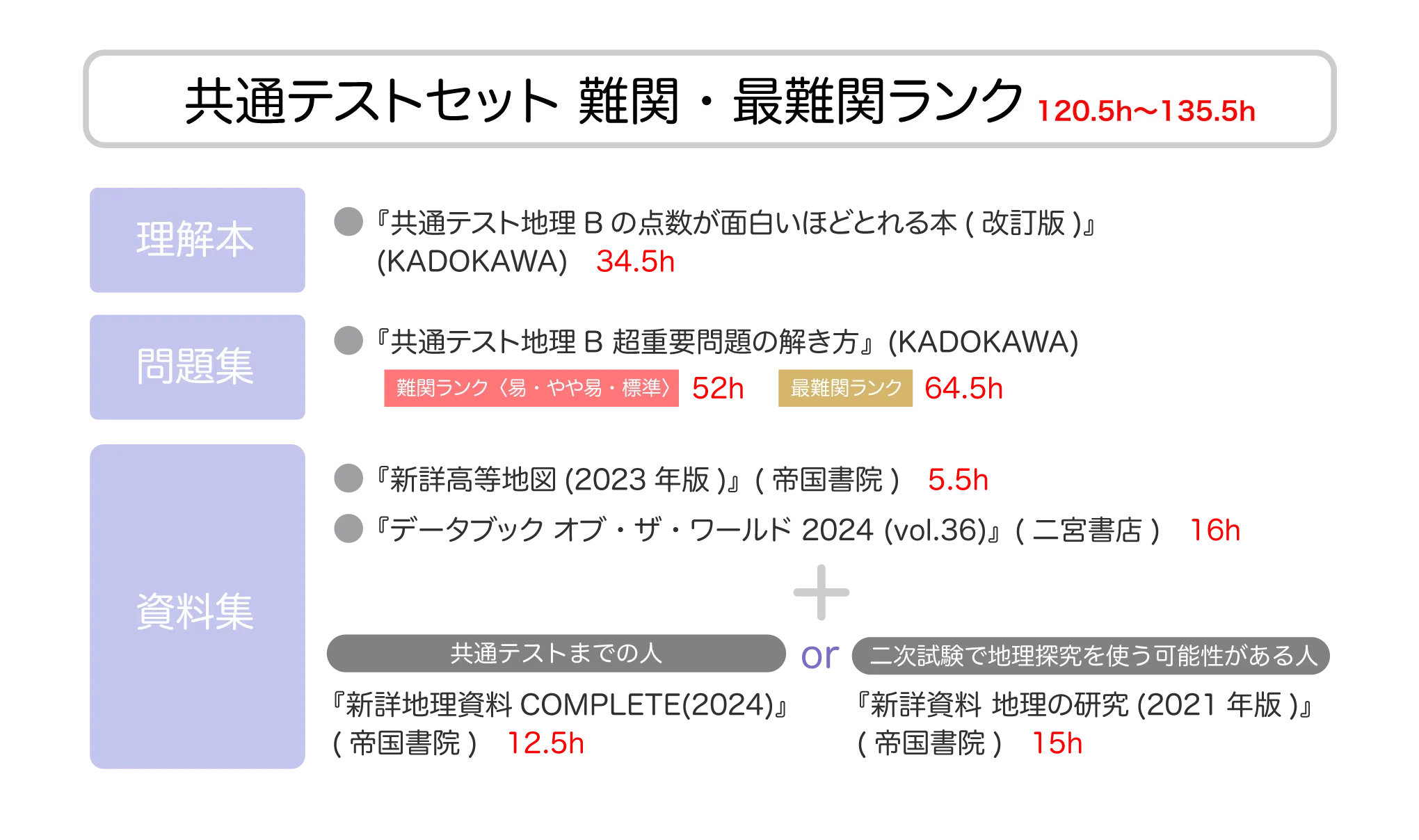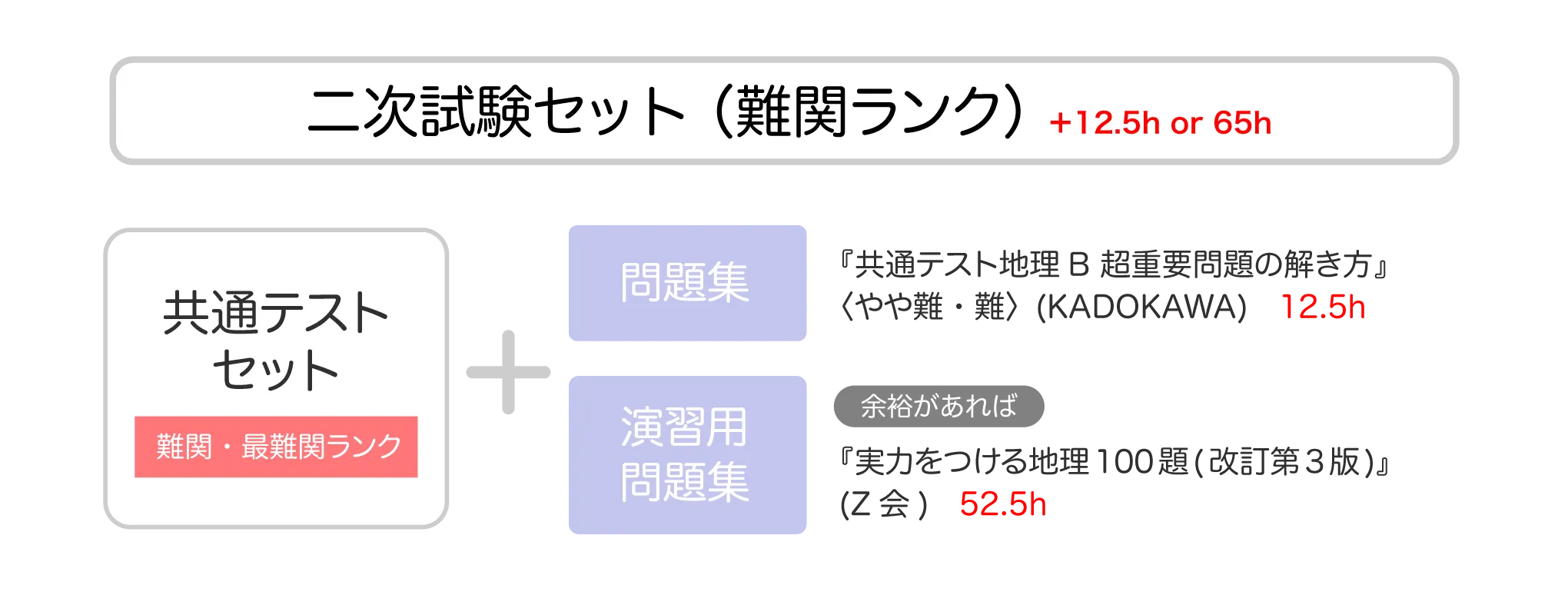 最難関ランクまで目指すと、かなり勉強量が多くなる。生徒の初期レベルに応じて簡単なレベルの学習を削るなどして、現実的に地理にかけられる時間数との兼ね合いで参考書を取捨選択する。(例:共通テストセットの問題集を『共通テスト新課程攻略問題集(地理総合・地理探究)』に差し替えるなど。)ただし、いずれの場合も『実力をつける地理100題(改訂第3版)』には初見で4割解けるレベルで臨むこと。