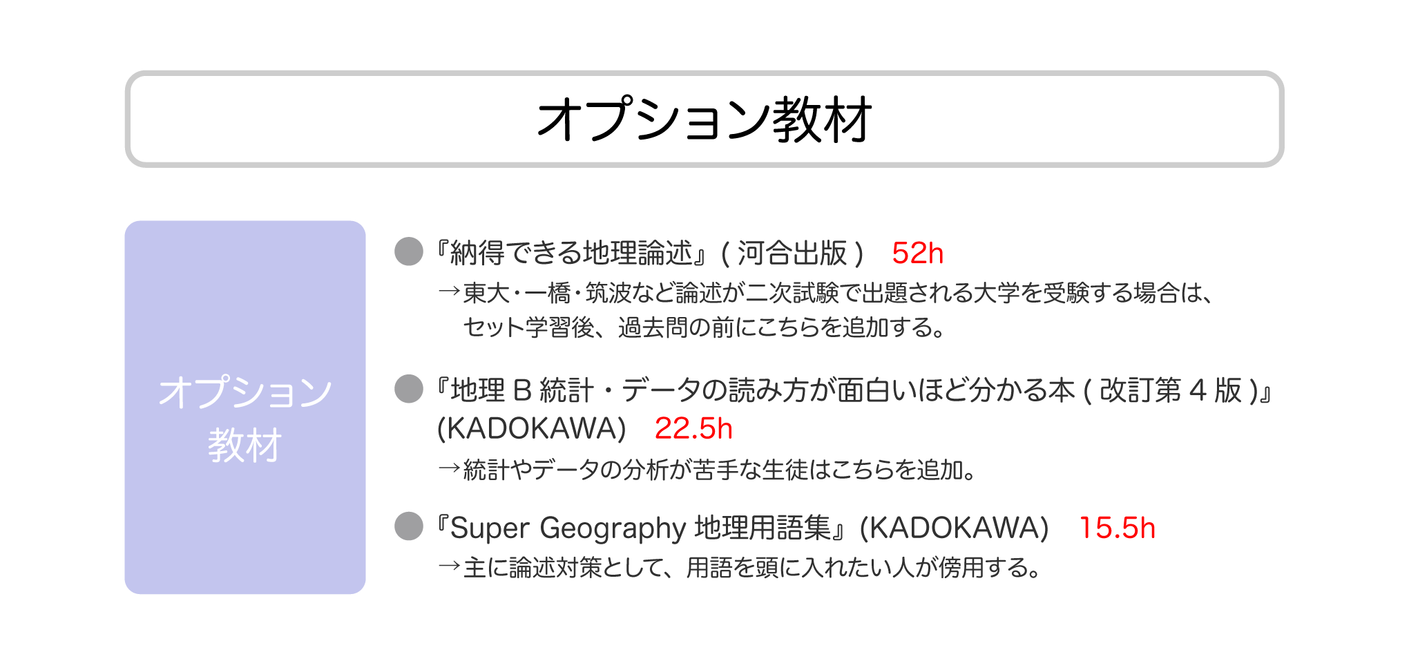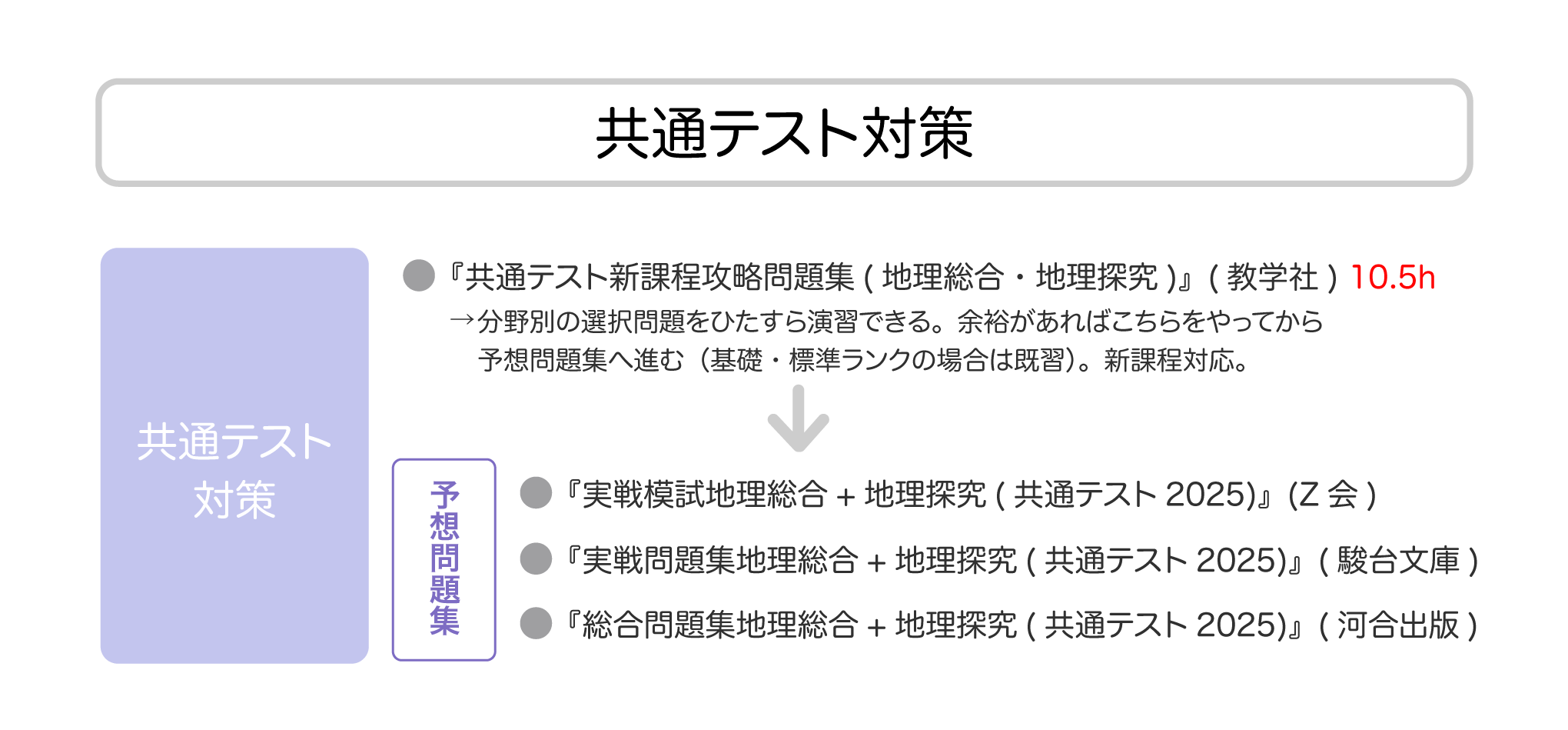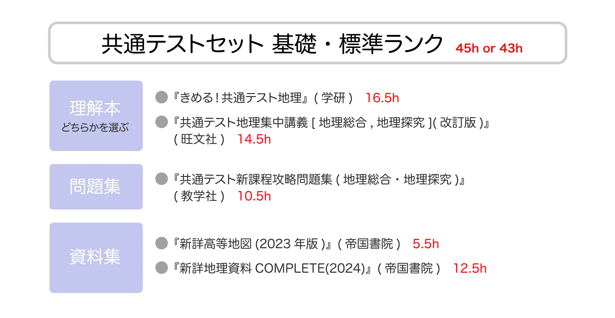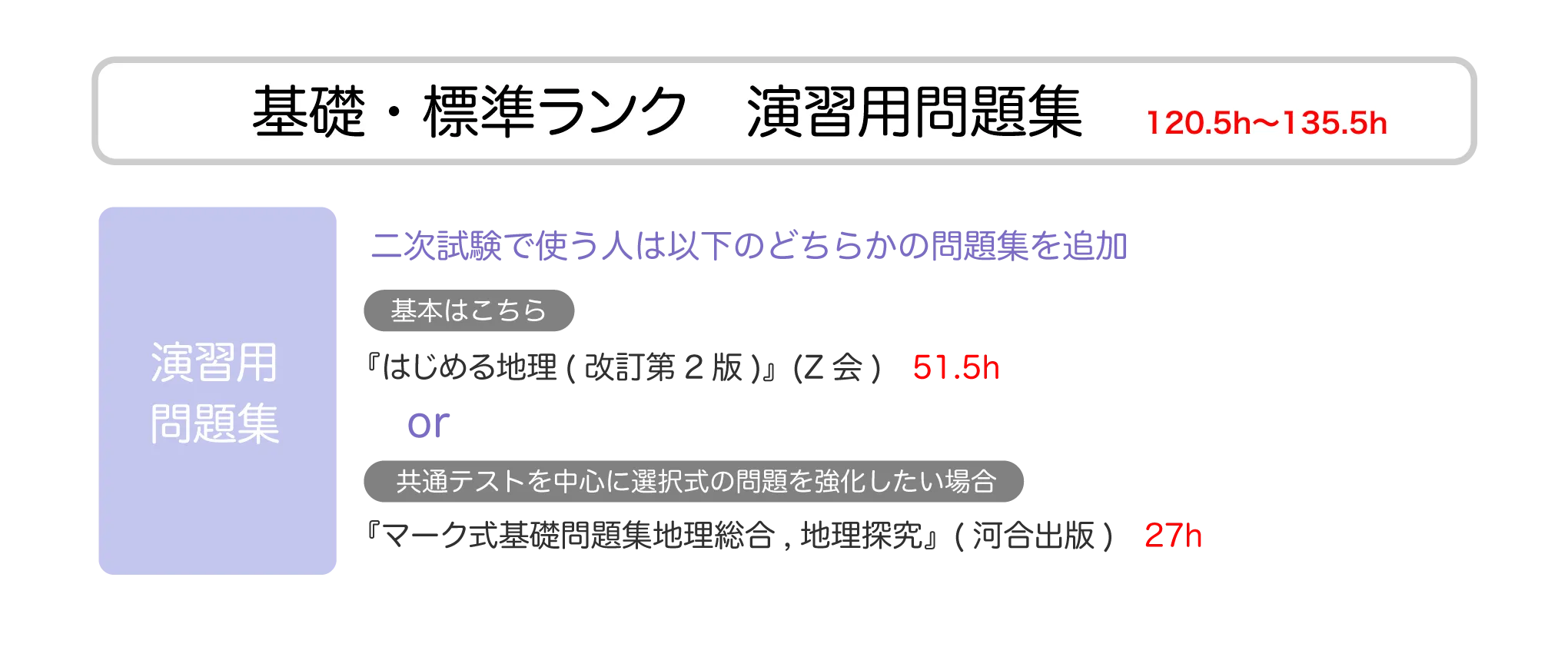 基礎ランク・標準ランクまでで地理選択の場合は特に、他科目に比べて地理に時間をあまり割けない生徒が多いこと、またそもそも地理は理系から文転した生徒が使用することもしばしばあることを踏まえて、できる限り時短したルートになっている。後々余裕があれば、追加の問題集まで解くのがおすすめ。