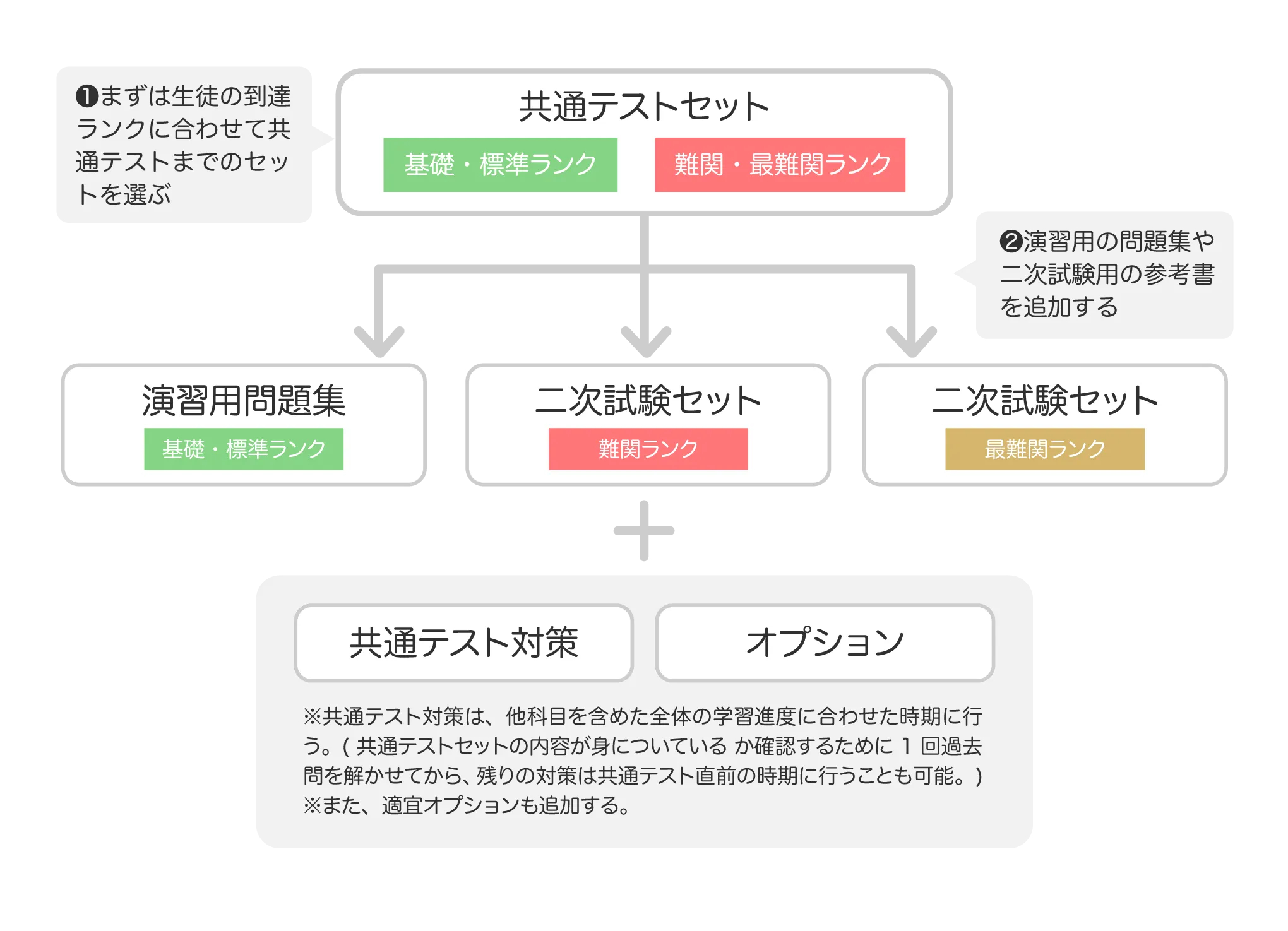 どの到達レベルの生徒でも、基本は同じ参考書を通過(当然カスタムすることもあるが、軸は同じ)。ランクを上げる=参考書を追加する。主要科目など、時間をかけて基礎に穴がないように固めていく科目に多い。