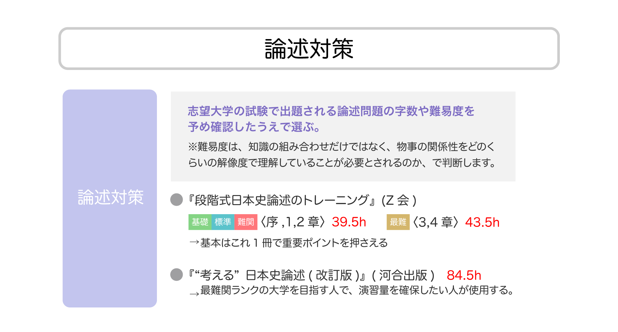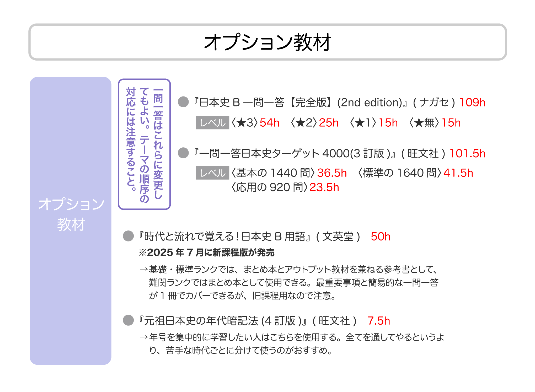 【所要時間】〈★5以上〉50h ①一問一答 ②教科書準拠の一問一答であり、共通テストから最難関国公立大までの広い範囲の用語が掲載されています。教科書の流れや言葉の言い回しをそのままに学べるほか、教科書への掲載数をもとに7つの★によって分けた頻出度が一目で判断できるのが大きな特徴です。この特徴を踏まえ、教科書の流れに沿って習熟度合いが測れることや、二次試験における記述問題対策にも適していることから、本書を基礎ランクから最難関ランクまで幅広く採用しました。 ③構成はシンプルでイラストや図表も無いため、教科書や理解本、資料集を併用して進めることが必要です。基礎・標準ランクでは、全ての用語を覚えるとオーバーワークのため、重要度★5以上の問題のみ取り組みます。なおこの基準は、本書が準拠している『日本史用語集』に記載された重要語句の範囲をもとに判断しています。