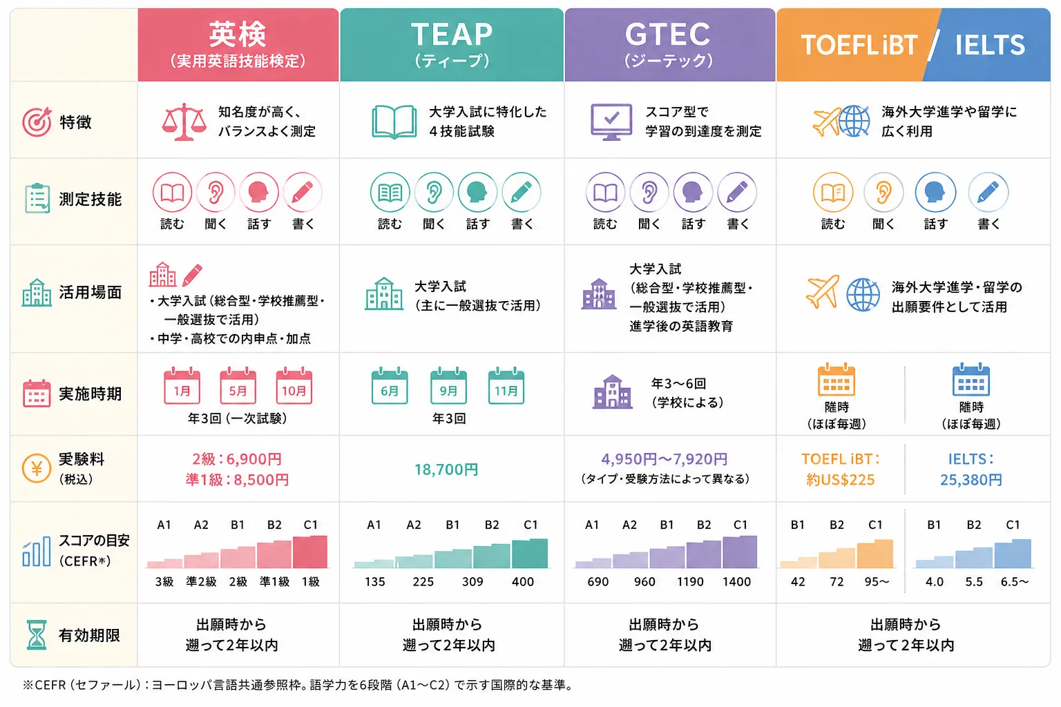 圧倒的な採用校数を誇り、迷ったら「まずは英検」と言えるほど汎用性が高いです。多くの高校生にとって馴染みがあり、対策本も豊富です。近年は、合否だけでなく「CSEスコア」という数値が重視されるようになっており、不合格でもCSEスコアが高ければ優遇を受けられる大学も増えています。 - TEAP(ティープ):