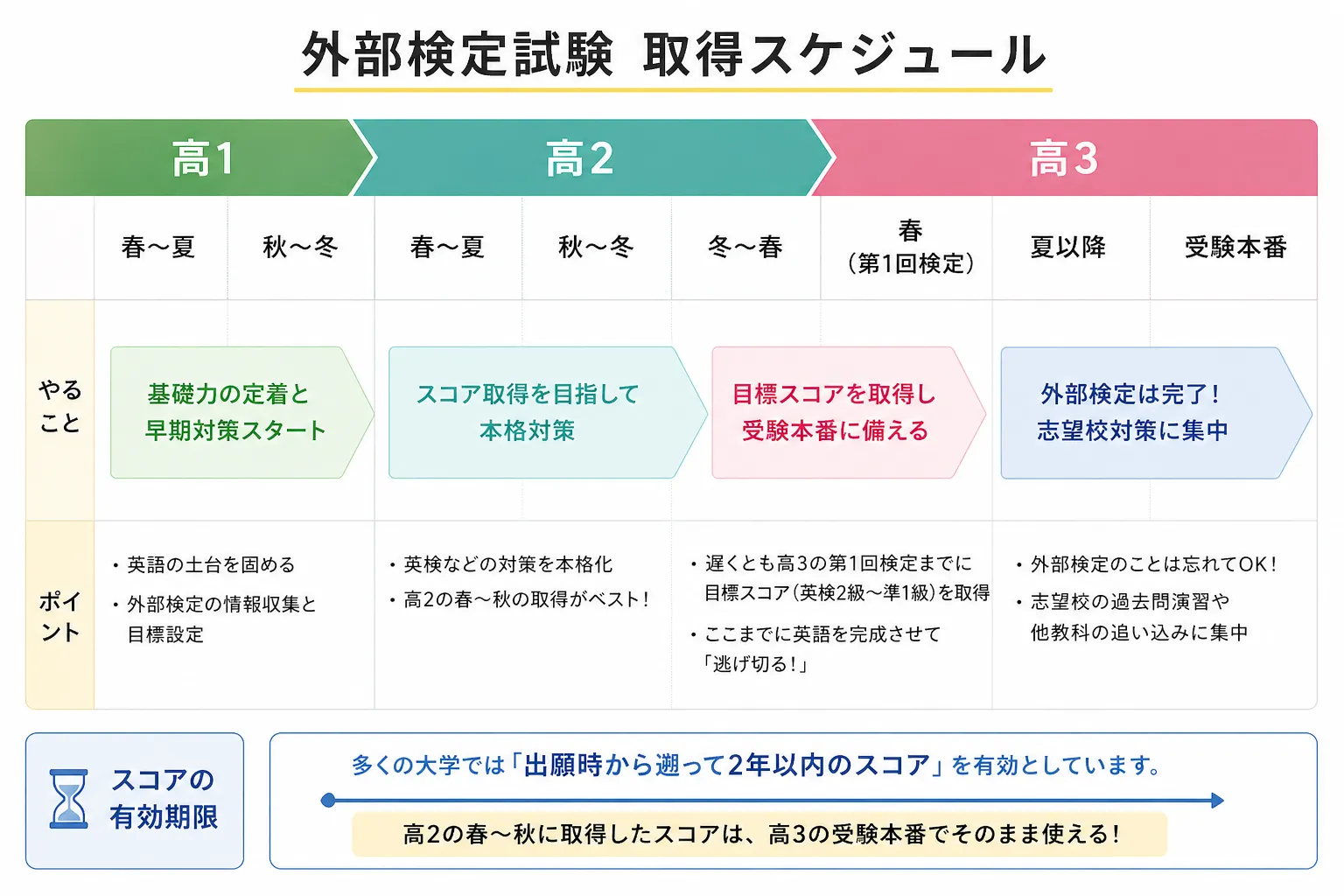 なぜなら、外部検定試験のスコアには「有効期限」があるからです。多くの大学では「出願時から遡って2年以内のスコア」を有効としています。つまり、高校2年生の春〜秋に取得したスコアは、高校3年生の受験本番でそのまま使えるということです。