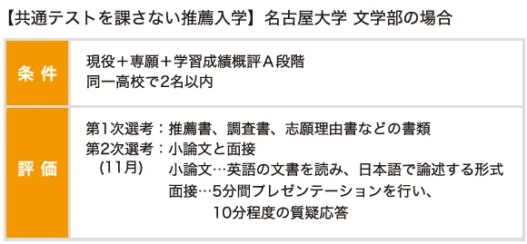 出願条件:現役生のみ、学習成績概評A段階、同一高校から3名以内。
