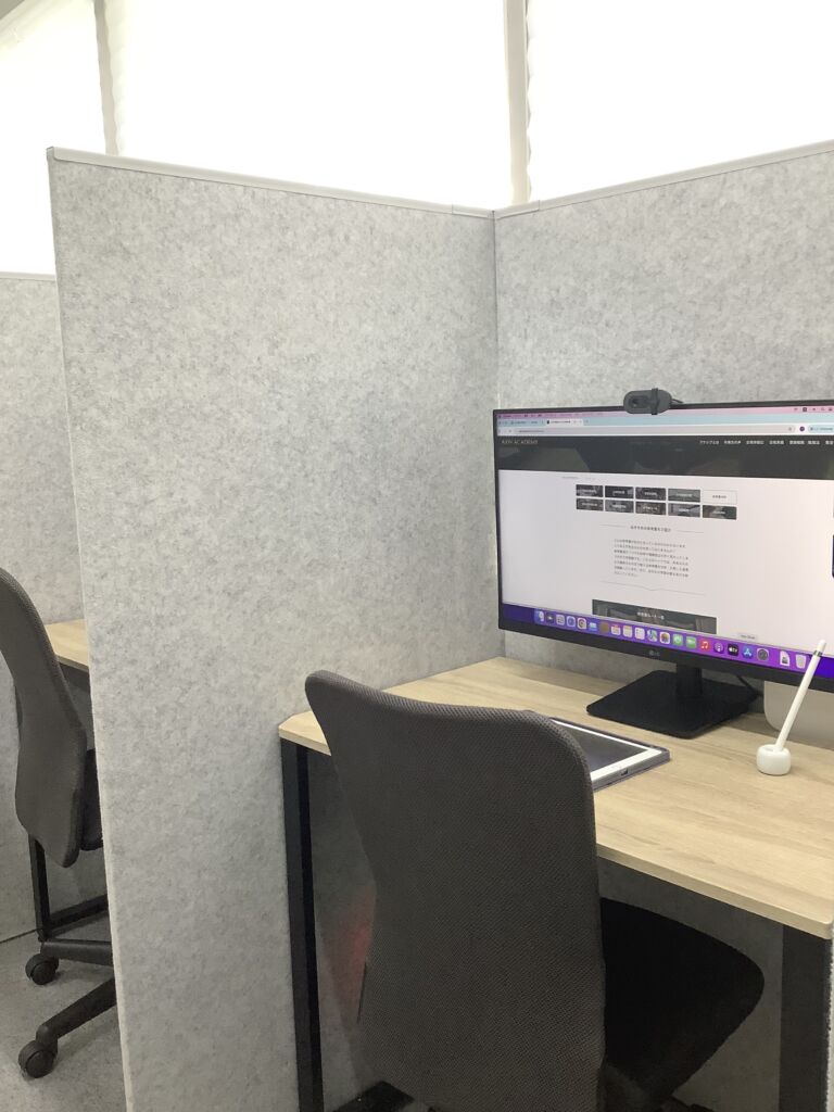 2023.12.13 2025.11.28 施設案内施設案内②個別授業ブース 個別授業ブースです。超難問の過去問、スピーキング、小論文対策など、様々な受験対策が可能です。PC画面で表情の認識や画面共有、iPadでノートの共有により、横でリアルタイムに授業を受けるのと同じ感覚で双方向授業を受けることができます。