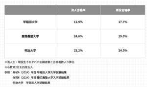 早稲田大学や慶應義塾大学は浪人生より現役生の方が約5%、明治大学では現役生の方が約1.3%高い合格率になっています。