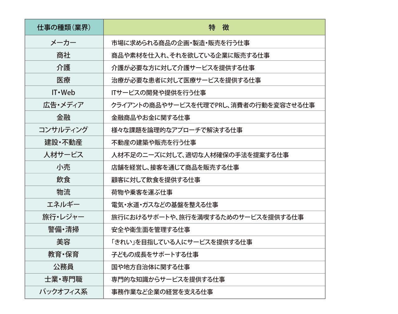 下記に、仕事の種類を業界別にご紹介しますので、ぜひチェックしてみてください。