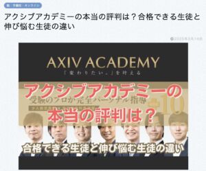 アクシブアカデミー受験関連情報メディア底辺高校に対する不安や悩みを解決するお手伝いをする「底辺高校.com」にアクシブアカデミーが紹介されました! 2025.03.14 2025.04.04 メディア底辺高校に対する不安や悩みを解決するお手伝いをする「底辺高校.com」にアクシブアカデミーが紹介されました! 底辺兎さんという方が運営されている。底辺高校に対する不安や悩みを解決するお手伝いをするべく、底辺高校に関する情報を発信している「底辺高校.com」というサイトにアクシブアカデミーが紹介されました!ぜひ、ご覧ください! アクシブアカデミーの本当の評判は?合格できる生徒と伸び悩む生徒の違い【徹底比較】底辺高校から大学を目指す!おススメの塾・予備校4選 科目別勉強法大学別対策学部別情報大学群別対策参考書分析学年別学習計画受験関連情報参考書ルート受験制度youtubecategoryALL受験コラム保護者向け受験情報教育最新情報お知らせメディア