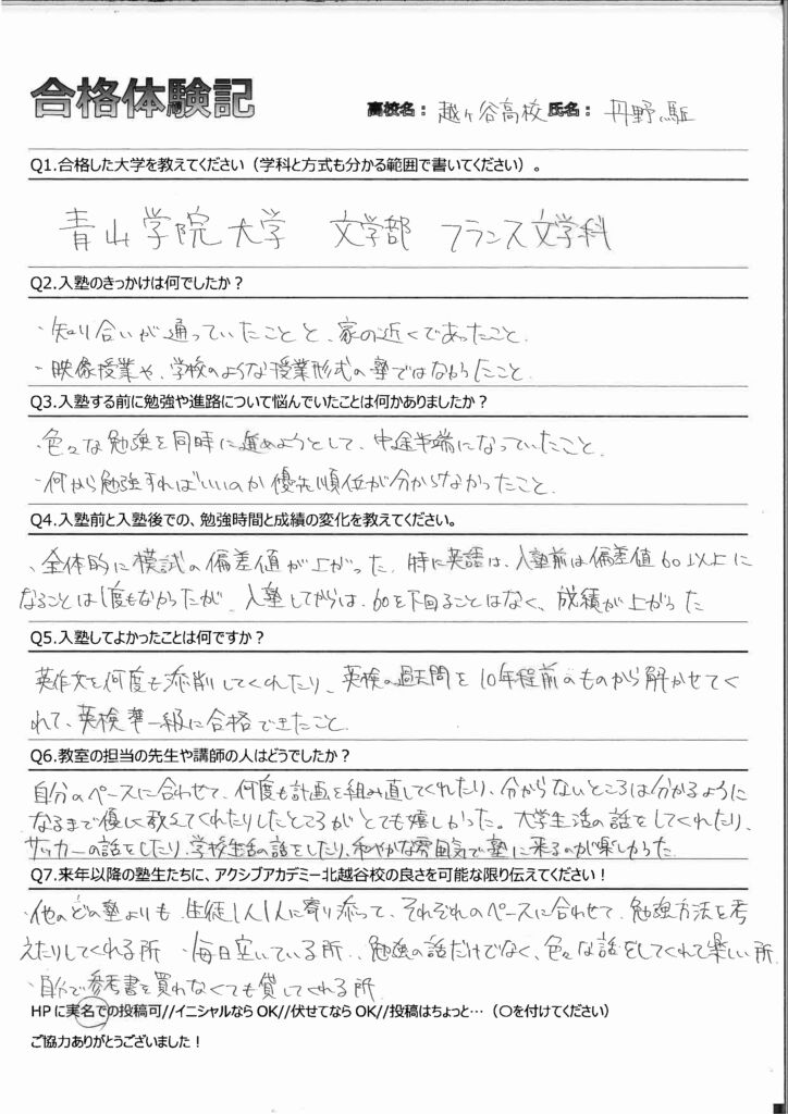 Q7.来年以降の塾生たちに、アクシブアカデミー北越谷校の良さを可能な限り伝えてください!
