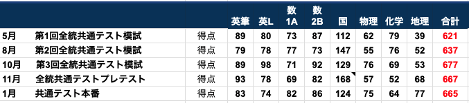 上述されているように、国語の学習は共通テスト前の演習のみでほとんどすることなく、英語・数学・物理・化学以外の学習は全て地理の学習に当てました。彼の志望校の場合、地理だけ配点に傾斜がかからず、素点がそのまま使えるので、他科目に比べて点数を上げることへのメリットが大きかったことも理由の一つです。
