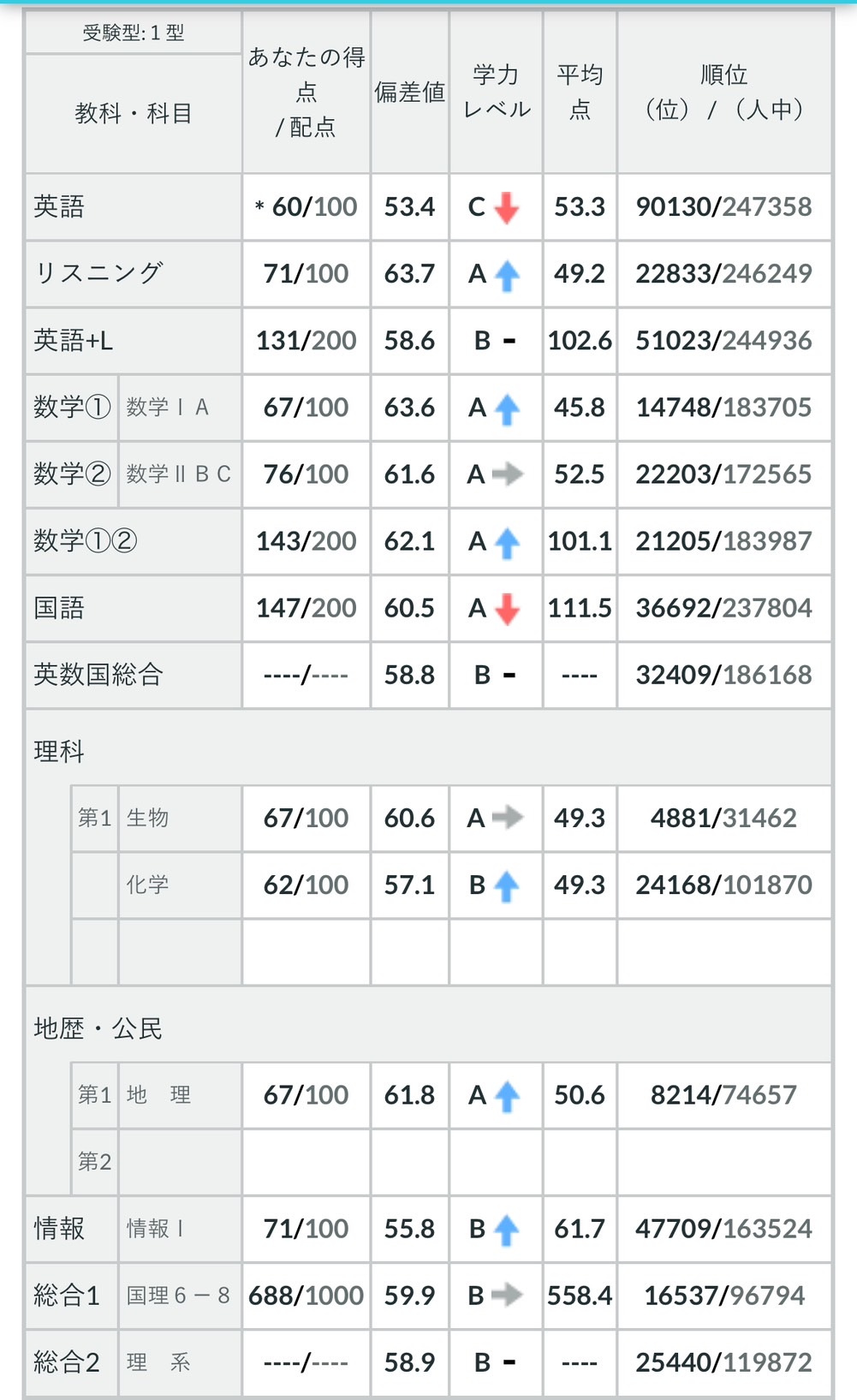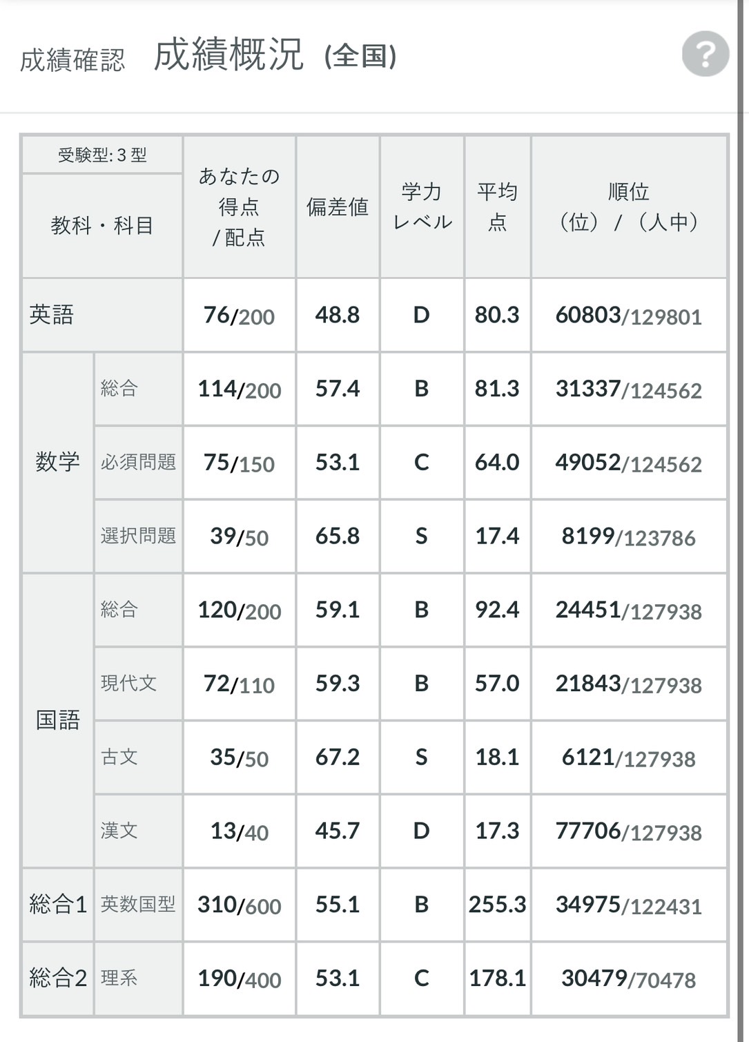 高校二年生の夏は全体的に成績が低かったです。特に、英語、数学の必須問題、漢文が苦手でした。 英語は今まで国語で身についていた文章力で誤魔化しながら解いていました。 そこで、英単語の暗記、文法の理解という基礎的な部分を固め、その後忘れないように繰り返し復習をしていました。 数学は得意な問題と苦手な問題に大きな差がある状態で、苦手な部分は基本的な理解から危うい状態でした。選択問題はS、総合でもBということからあまり苦手なように見えないかと思いますが、選択式の問題の時になんとか解けているだけで、記述式の模試や学校のテストは散々な結果でした。アクシブにも数学を習うため、入塾しました。先生が理解できていない部分に気づき、そこを詰めてくださることで段々と理解できるようになりました。特にこの模試では使用しませんでしたが、数学Ⅲもお勧めを受けた「ハイレベル数学Ⅲ」と先生による指導で救い上げていただきました。そして、最終的には共通テストで数学ⅠA91点数学Ⅱ79点を取ることができました。