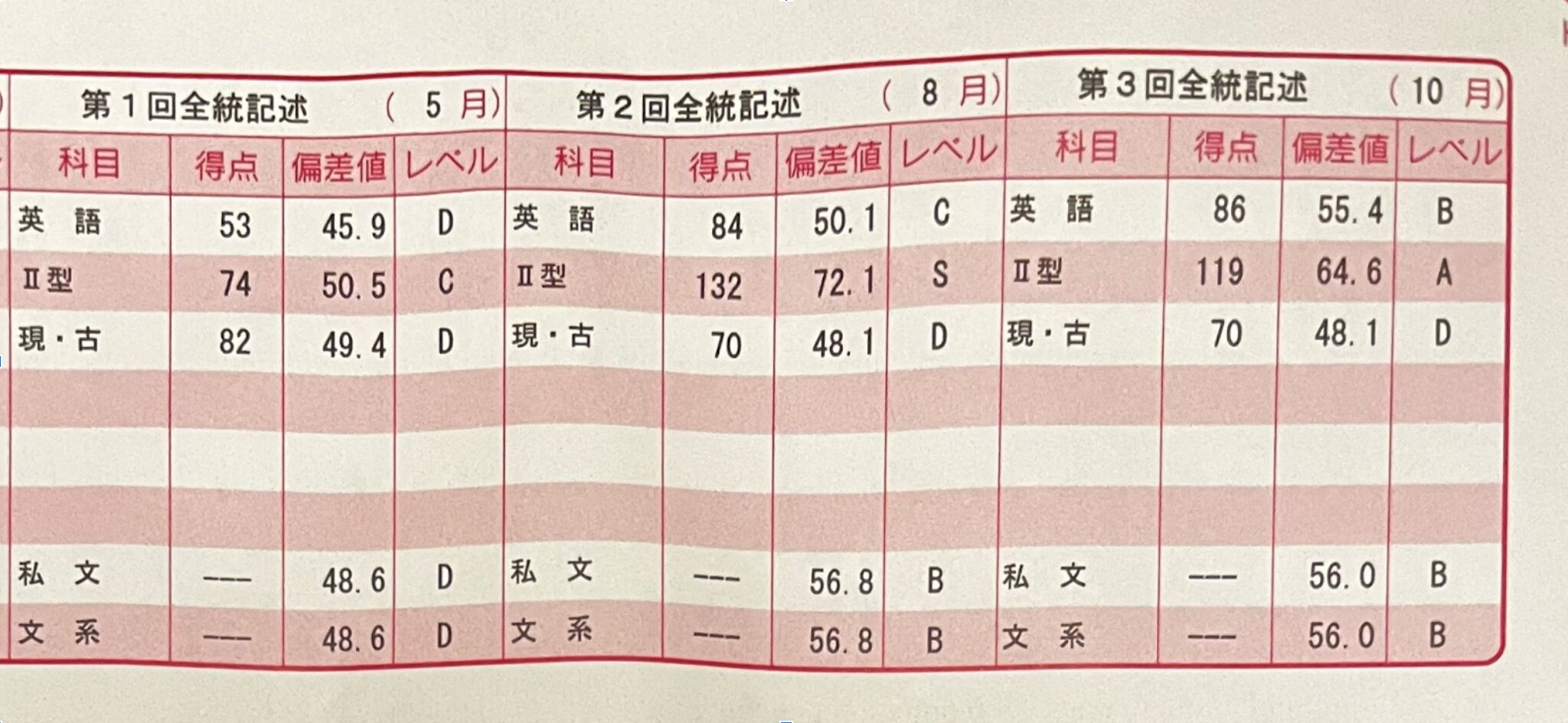 5月との偏差値を比較すると英語は約10up、数学は14up、国語は1down。英語は徐々に上がっているかなという感じでした。数学は波が激しかったので苦手をなくせば安定してとれるかなという印象でした。国語はさすがに古典単語と文法だけでもやらないといけないなという感じでした。