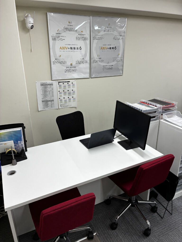 2024.03.30 2026.01.24 施設案内施設案内四条烏丸校の施設案内④戦略授業ブース 2週間に1度社員であるコーチとおこなう戦略授業ブースです。授業時はパーテーションを置くため、メンタル面や個人的な相談などプライベートなことも話しやすい環境にしております。