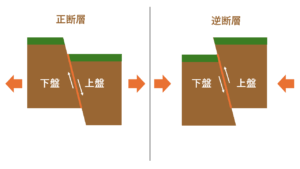 地学基礎で最も求められる力は暗記力です。ただし、文をそのまま丸覚えするのではなく、図をイメージできるものは図の意味を理解したうえで、イメージごと覚えるようにしましょう。例えば、下の図に正断層と逆断層の模式図を示しています。「正断層は左右に引っ張る力が加わり、上盤が下方向に移動する」と覚えるだけよりも、正断層・逆断層のずれ方と力の向きなどが描かれた下の図を理解していたほうが、出題のされ方が変わったときにも対応できる力がつきます。図の意味を理解したと思ったら、理解本と全く同じ表現でなくて構わないので、図示されている内容を自分の言葉でも説明できるか試してみると、知識の定着度をはかることができるのでおすすめです。