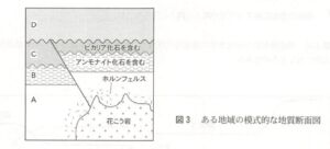 この図において地層が堆積した順番を考える際には、不整合や断層などの地層の読み取りのための技術が必要となりますが、それに加えてビカリア化石やアンモナイト化石などの地球史の中で登場する化石の年代を知っているか、接触変成作用によってつくられるホルンフェルスを知っているかが問われています。そのため、この問題は地球の歴史と固体地球の概観と活動の2分野にまたがる知識が求められる問題でした。